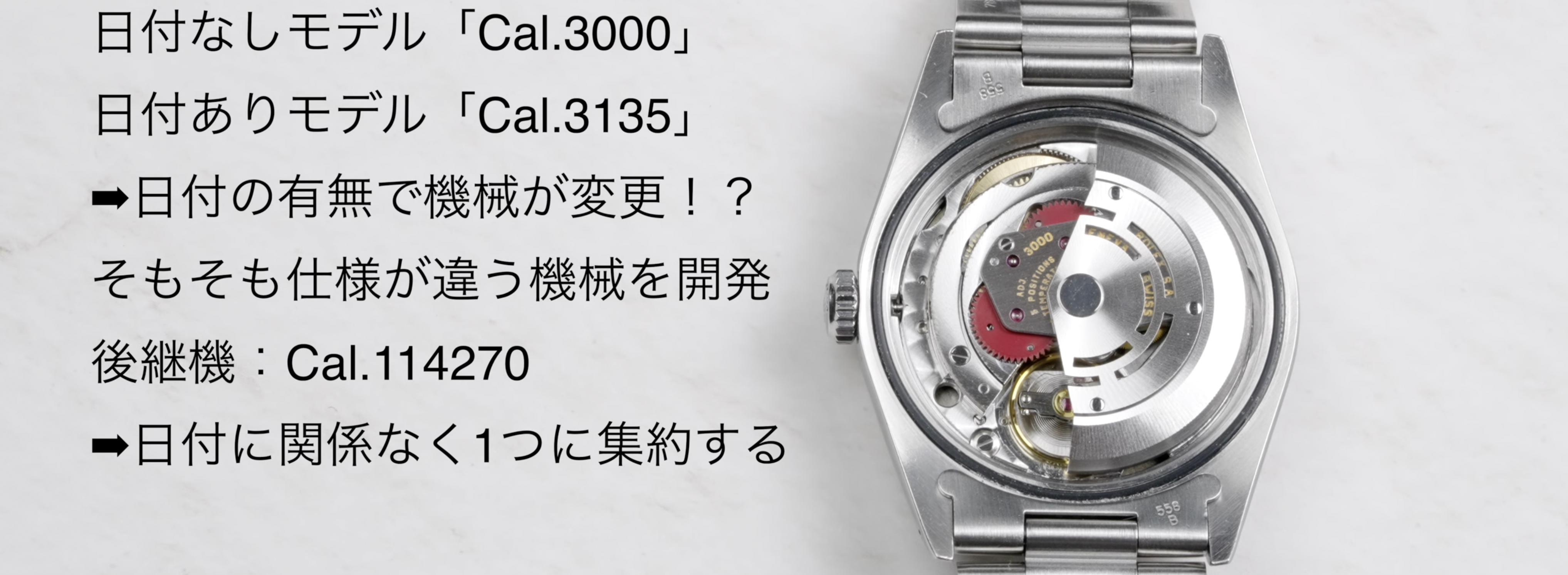 「エクスプローラーⅠ」には「Cal.3000」というムーブメントが採用されていますが、実は同時期の日付ありのモデルには「Cal.3135」というムーブメントが搭載されています。
