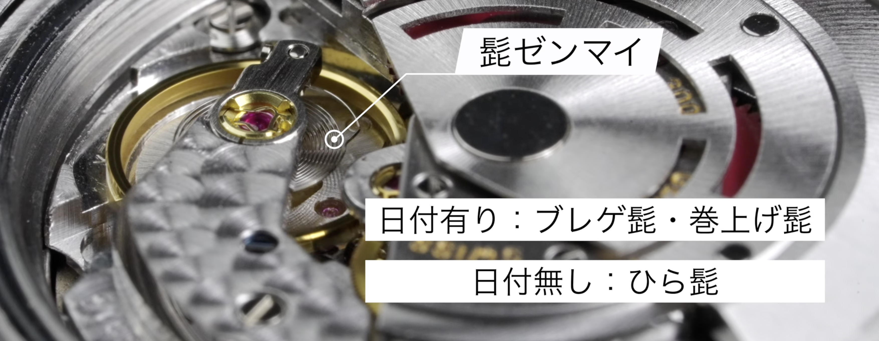 そして「Cal.3000」と「Cal.3135」の違いですが、日付有りのキャリバーには「ブレゲ髭」という巻上げ髭が使われていますが、日付なしのキャリバーには「ひら髭」を使っているため、この部分も謎になっています。