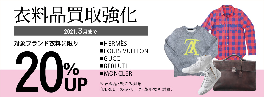 2月・3月は、モンクレール・ルイヴィトン・グッチ・ベルルッティの衣料品・靴を通常査定価格から20%UPでお買取り!