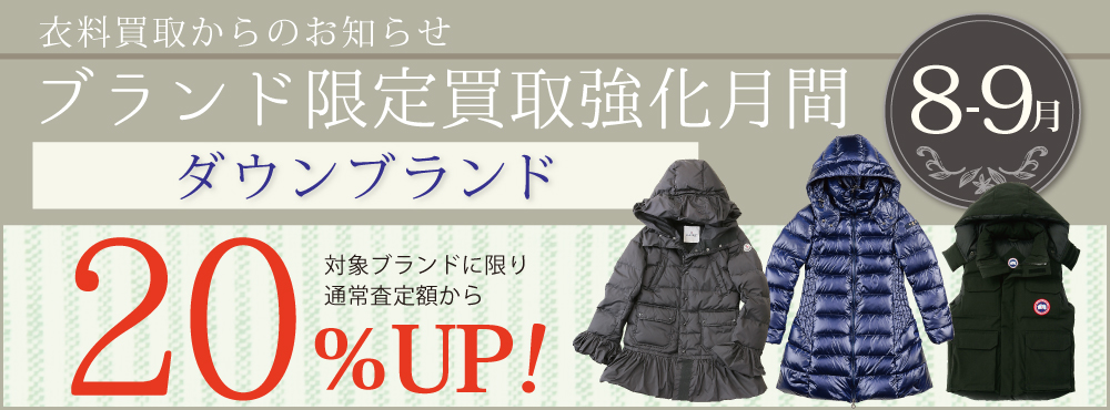 8月、9月は人気ダウンブランド「モンクレール」「カナダグース」「タトラス」のアイテムを