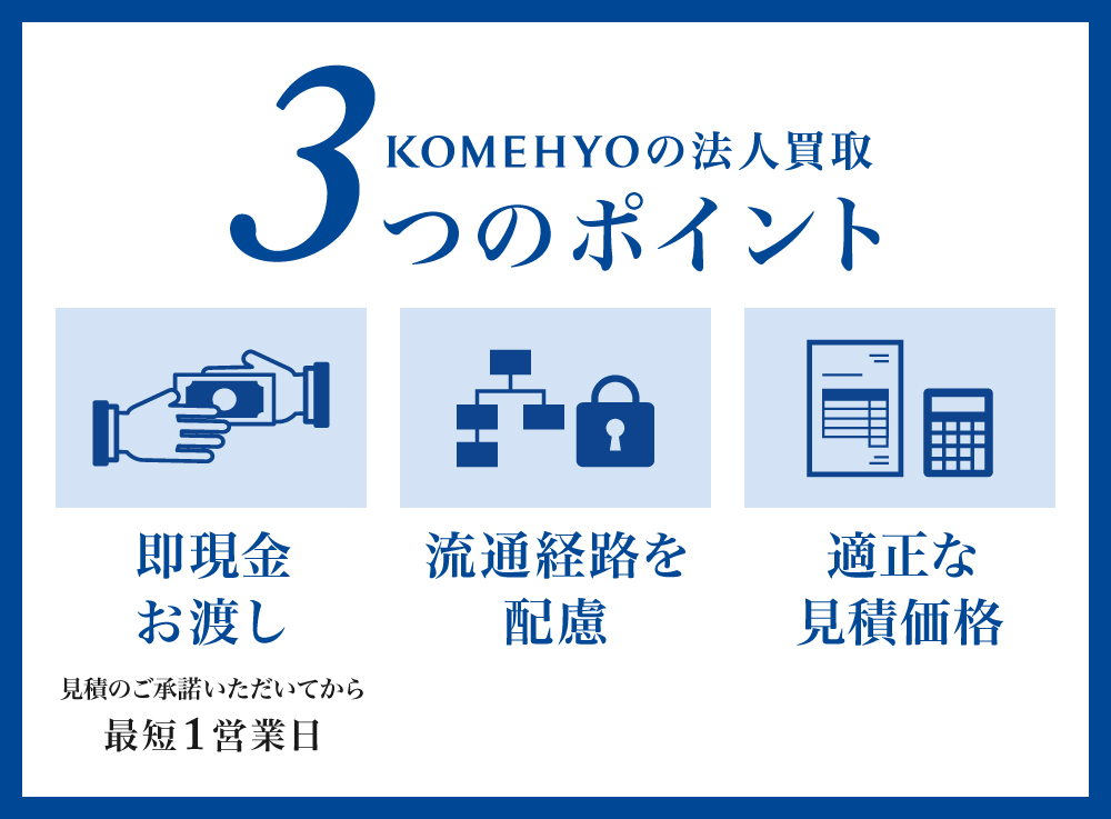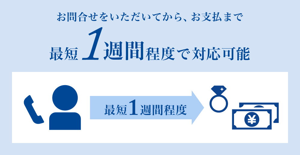 他社では当月締め・翌月支払いが多く、お支払までに時間が掛かってしまいますが、KOMEHYOならご連絡をいただいてから、お支払いまで最短で1週間程度で即お支払いができます。今すぐ必要なニーズに最大限お応えいたします。