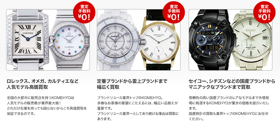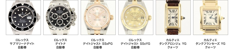 買取り強化ブランド一例: ロレックス、カルティエ、パネライ、ジャガールクルト、ハリーウィンストン、ロジェデュブイ、タグホイヤー、ブライトリング、フランクミュラー、ベル&ロス、オメガ、ゼニス、オーデマ・ピゲ、 ブレゲ、ブランパン、ヴァシュロン・コンスタンタン、ランゲ&ゾーネ、ジャガー・ルクルト、IWC、パネライ、セイコー、G-SHOCK etc.……
