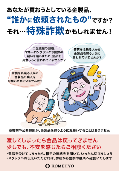 警察官や行政機関・金融機関などを名乗り、金・地金を購入させ搾取するなどの詐欺が増加しています。