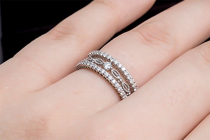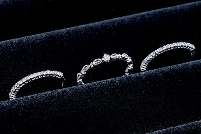 リングで定番人気のエタニティやハーフエタニティ。ひとつは持っている、という女性も多いかと思います。しかし、ちょっと華奢なデザインが多いので、ひとつではボリューム不足な印象になってしまう場合も。