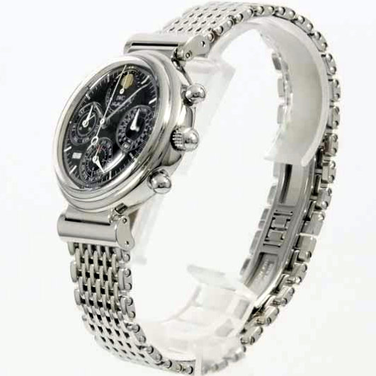 具体的には、ダヴィンチはETA社の自動巻クロノグラフムーブメント“Cal.7750”を基本ムーブメントに採用しました。つまり、ダヴィンチは「永久カレンダー + クロノグラフ」機構となります。当時のダヴィンチはもう廃番になっていますが、1990年代中頃のイエローゴールド製で革バンドのダヴィンチは200万円台前半の価格で売られていました。参考のためにですが、同時期のパテックフィリップの“永久カレンダークロノグラフ”は1400万円ぐらいだったと記憶しております。ブランド力の差はありますが、同じ“永久カレンダークロノグラフ”という機能の時計でも、これだけの価格差が生じました。