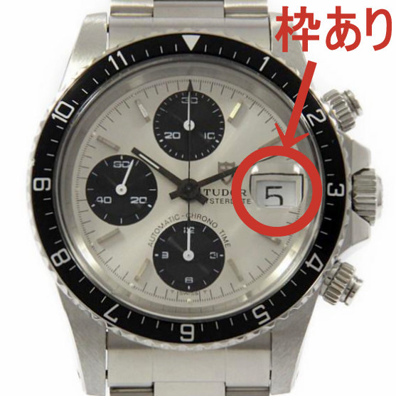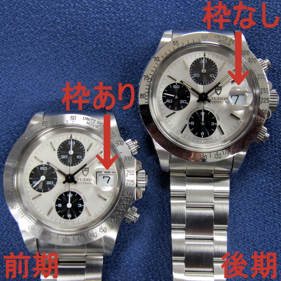 また、このカマボコケースをもつクロノタイムの第二世代を、大きく「前期」「後期」と分ける風潮があります。前期と後期にはいつくかの違いがありますが、もっとも目に付くのは“日付表示の周りにある四角い線”です。これを「枠(わく)」と表現しており、枠がある方が「前期」で、枠がない方が「後期」にあたります。