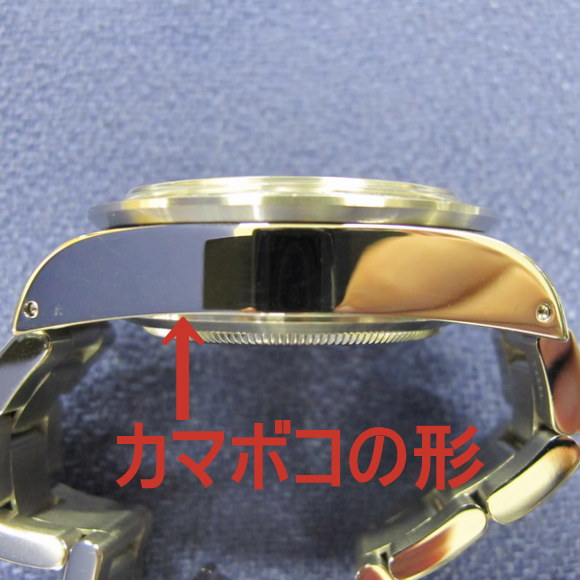 日本では、横から見た形が「“かまぼこ”みたい」なので、「カマボコケース」や「カマボコ」などと呼ばれるようになります。ちなみに、ロレックスのデイトナを横から見ると、3次元的な流線型をしているので、カマボコのようには見えません。さらに補足すると、1995年以降の第三世代のクロノタイム(79260、79270、79280)はデイトナのような流線型ケースを持っています。そのため、“第三世代との違い”を表現する意図で、第二世代以前を「カマボコケース」と言っていることが多いのです。