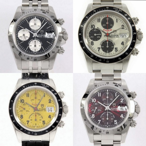 なお、チュードルクロノグラフは、同じ時代に複数の型式をもつことが多い状況です。これは、ベゼルの種類でバリエーションがあるからです。その種類は、着色プレートにタキメーターを描いた通称「プラ(スチック)ベゼル」、可動ベゼルに12時間インデックスを描いた「回転ベゼル」、金属ベゼルにタキメーターを描いた「メタルベゼル」です。以降で型式が複数登場するのは、そのためだとご理解ください。