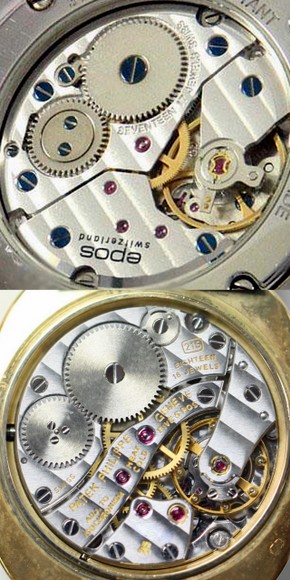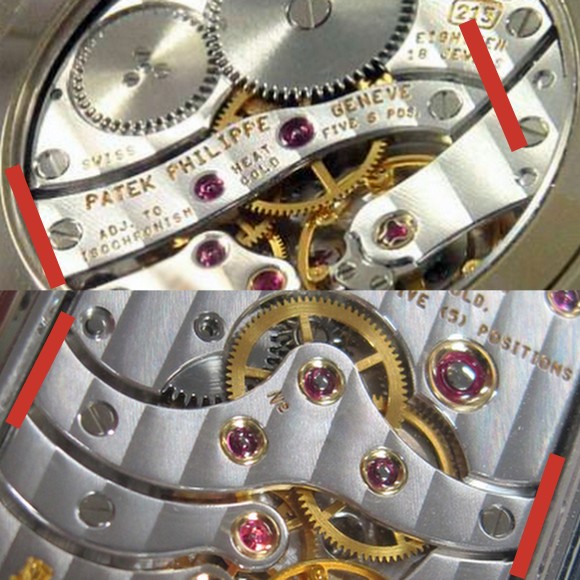 例えば、上の画像は、同じ手巻ムーブメントですが、印象が全然違います。おそらく、多くの方は、下の画像のムーブメント(Cal.215)の方が美しく感じるのではないでしょうか。やはり、“受け”の違いがポイントになっています。一般論で美しい“受け”の条件をまとめると、次のようになります。