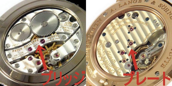 上の画像を見ていただくと分かりやすいと思います。分割が少なく、“幅広い板”の形状であれば「プレート」、細長く分割されて“ムーブメントに架かっている橋”のように見える形状であれば「ブリッジ」です。例えば、上の画像の左のムーブメントの中央には、細長い“受け”があります。これは、まさに「ブリッジ(橋)」のようです。そして、画像の右のムーブメントは、ドイツ式の「3/4プレート」と呼ばれるものです。「3/4ブリッジ」と言う人はいませんので、やはり“幅広い板”になると「プレート」と表現します。