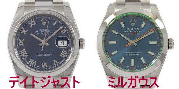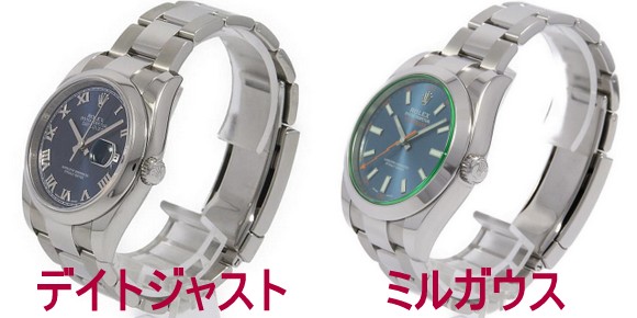 ここからが本題です。冒頭でも書きましたが、ミルガウスはロレックスにおいて「“変り種ロレックス”である」ことを目指しているように感じます。先の基本情報でも紹介した“個性的な文字盤デザイン”からも、それを感じるはずです。下に、一般モデルである「デイトジャスト」との比較画像を用意しましたので、その個性の違いを確認してみてください。