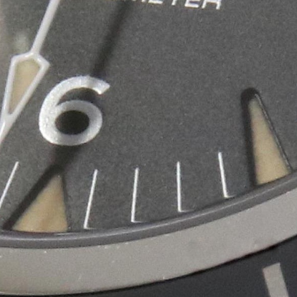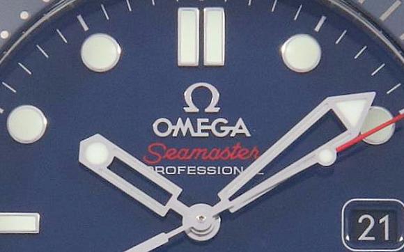 一方、シーマスター300の針とインデックスは、アロー型の時針とドーフィン型の分針、そして、楔型のインデックスで構成されています。全体的に三角形を多様したデザインで、「シャープなデザイン性」を重視しているように感じます。もちろん、夜光塗料はしっかりと塗布されていますので、視認性も確保されています。