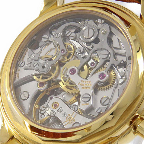 レマニア2310は、1940年に設計されたムーブメントが元で、コラムホイール・キャリングアーム式のクラシカルな設計です。それを、パテックフィリップは、ジュネーブシール仕様にまでブラッシュアップします。そのため、このパテックフィリップのクロノグラフムーブメントは、本当に美しい外観をしています。