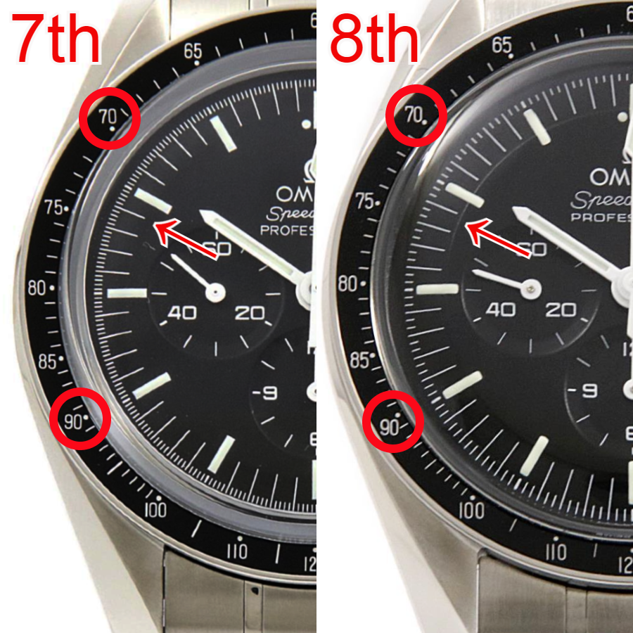 また、フェイス部にも変更点があります。文字盤の外周部に“段差”が設けられ、タキメーターのデザインも変更がありました。タキメーターはわかり難い変更点かもしれませんが、「70」と「90」の数字部分の近くにあるドットの位置が変わっています。