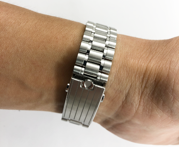 通常、バンドのラグから留め具にかけてのテーパーは、「約2㎜」の幅分を細めていくことが一般的です。実際に、最近までのムーンウォッチのブレスレットもそうでした。しかし、8世代目のムーンウォッチは、「約5㎜」も幅を細めてテーパーしたブレスレットを採用しています。そのため、腕に装着した印象として、手首の内側からの見た目がやや華奢な印象になり、ヴィンテージの時代のブレスレットのような感じがします。
