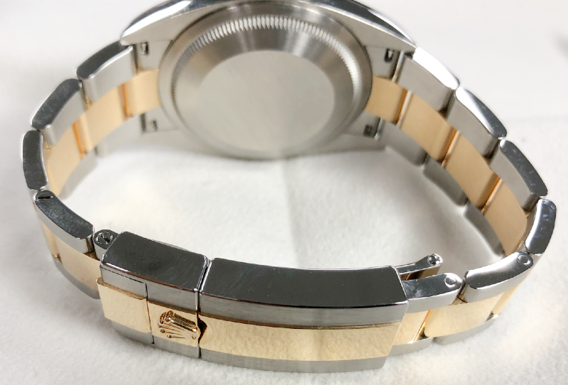 これはもちろん、ベゼルやブレスレット中央に18金ゴールドを採用していることもありますが、個人的には、「針とインデックス枠が金色である」ことが大きな要因と感じます。なぜなら、針やインデックス枠は、時計のフェイス部にありますので、そのフェイス分がより豪華に見えるのです。その印象の良さは、実機を見るとよくわかります。