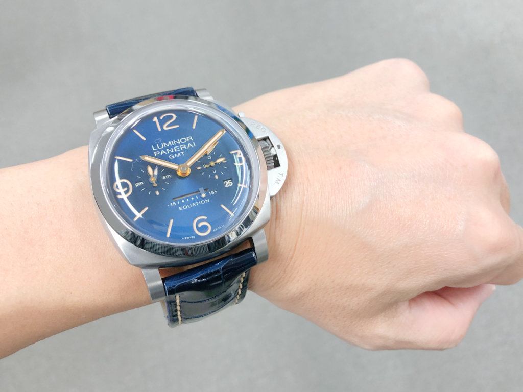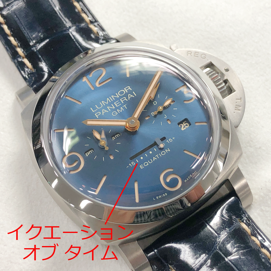 例えば、下の画像のパネライ「ルミノール イクエーション オブ タイム」は、その名の通り、イクエーション オブ タイム(以下、イクエーション)の機能を持つモデルです。